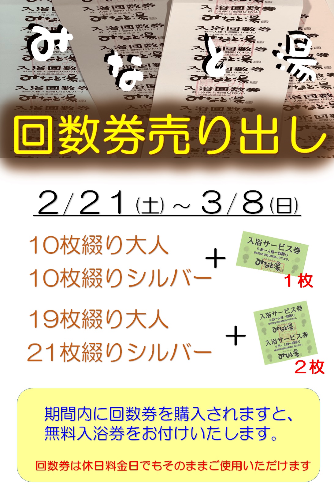 2月21日(土)~3月8日(日)の間に、回数券を購入頂いた方全員に、無料入浴券を付けさせて頂きます。